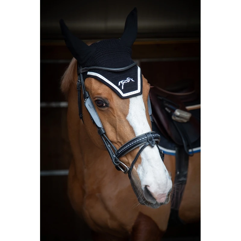Un bonnet aux oreilles élastiques et souples. Ce bonnet est ce qu’il y a de plus confortable pour votre cheval, pour qu’il ne soit pas perturbé par l’environnement et les insectes lors des concours. En coton crocheté, le bonnet point sellier fly coton est décoré d’un galon blanc sur le contour du chanfrein et la broderie blanche de la marque est assortie pour plus d’élégance. Sa forme est parfaitement dégagée derrière les oreilles pour pouvoir mettre un bridon anatomique. Il est doté d’une découpe carrée à l’avant.