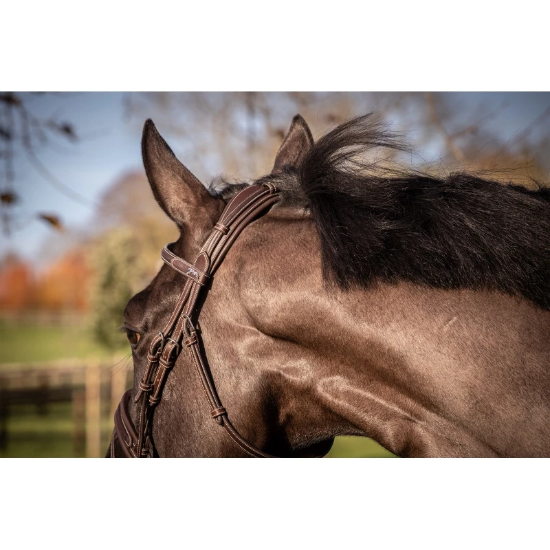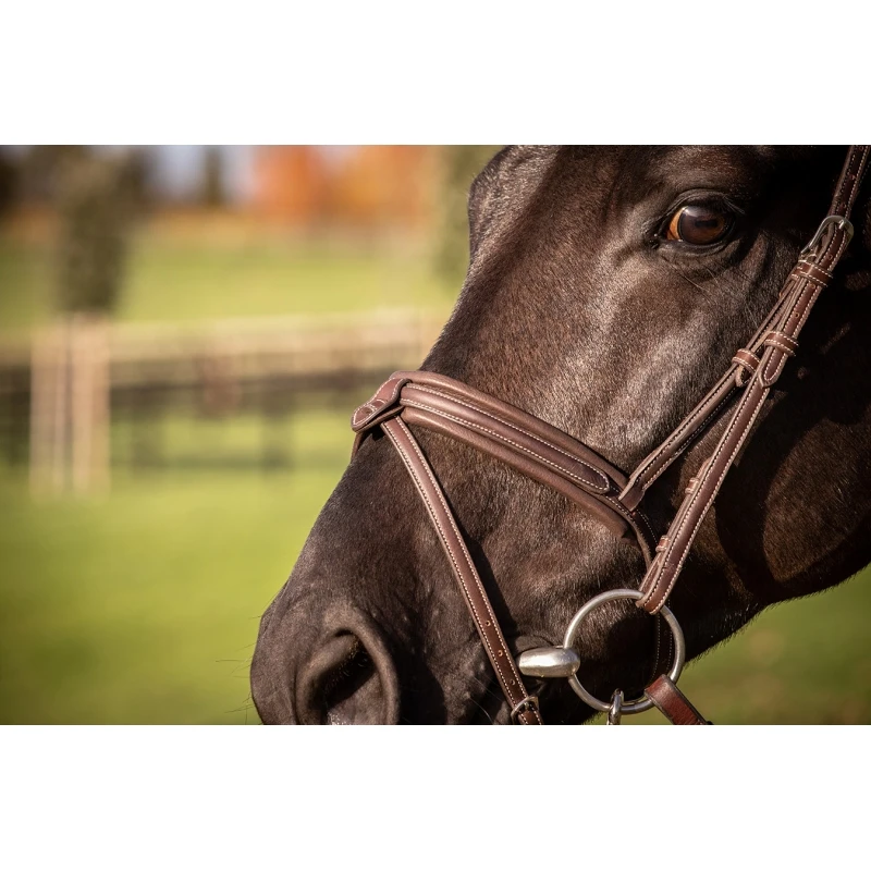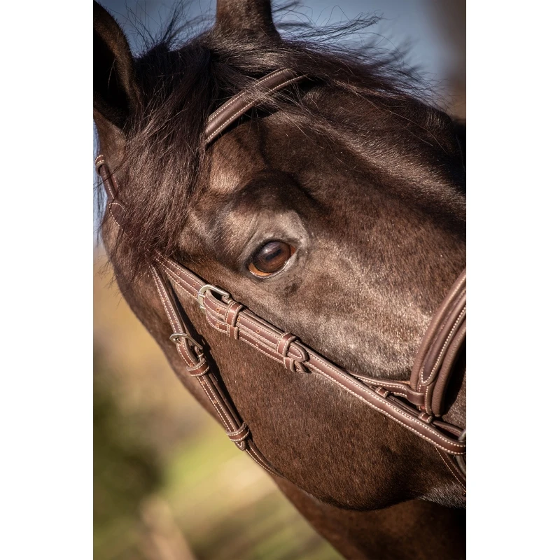 Bridon « Elégance » Pénélope orné de surpiqûres crèmes en contraste. Il est composé d’une muserolle large combinée doublée de cuir souple et d’une têtière anatomique elle aussi doublée de cuir souple sur la zone en contact avec la tête du cheval. Sur le dessus de la têtière se trouve un insert fin décoratif glissé dans des passants en cuir. Le pin’s Pénélope argenté est fixé à gauche sur le passant du frontal.