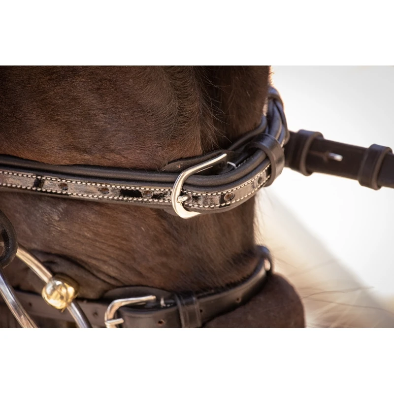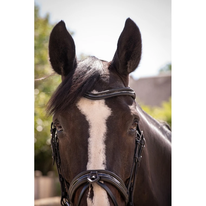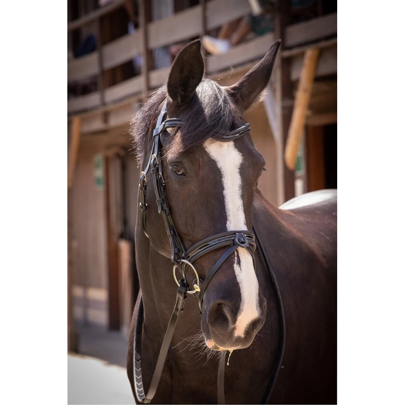 Bridon Pénélope en cuir avec têtière, frontal et muserolle ornés de surpiqûres crème en contraste et doublés de cuir souple, y compris à l’arrière. La forme du frontal est en V pour dessiner le chanfrein. La muserolle est large et dotée d’un noseband. La têtière est élargie pour répartir la pression sur la nuque du cheval. Le bridon Smoothie est vendu avec sa paire de rênes. Il peut être utilisé en concours hippiques comme à l’entraînement aux écuries. Les extrémités des fermetures sont doublées d’un élastique qui adoucit le contact avec le cheval et lui apporte plus de confort.