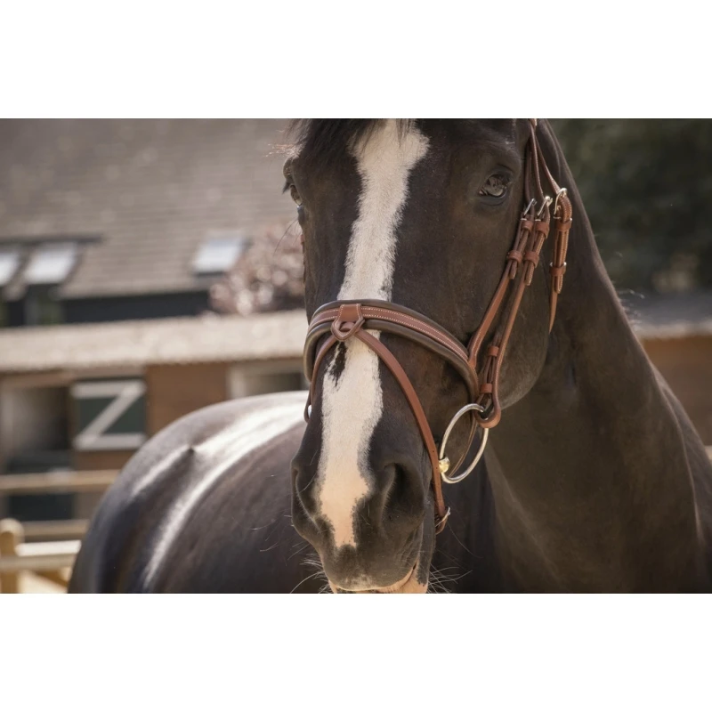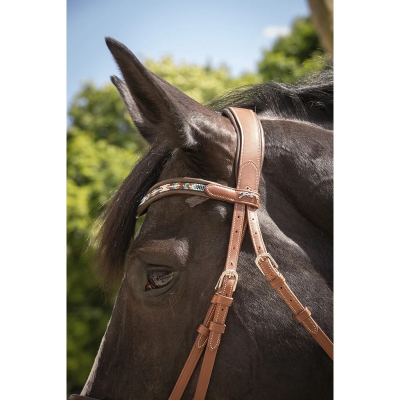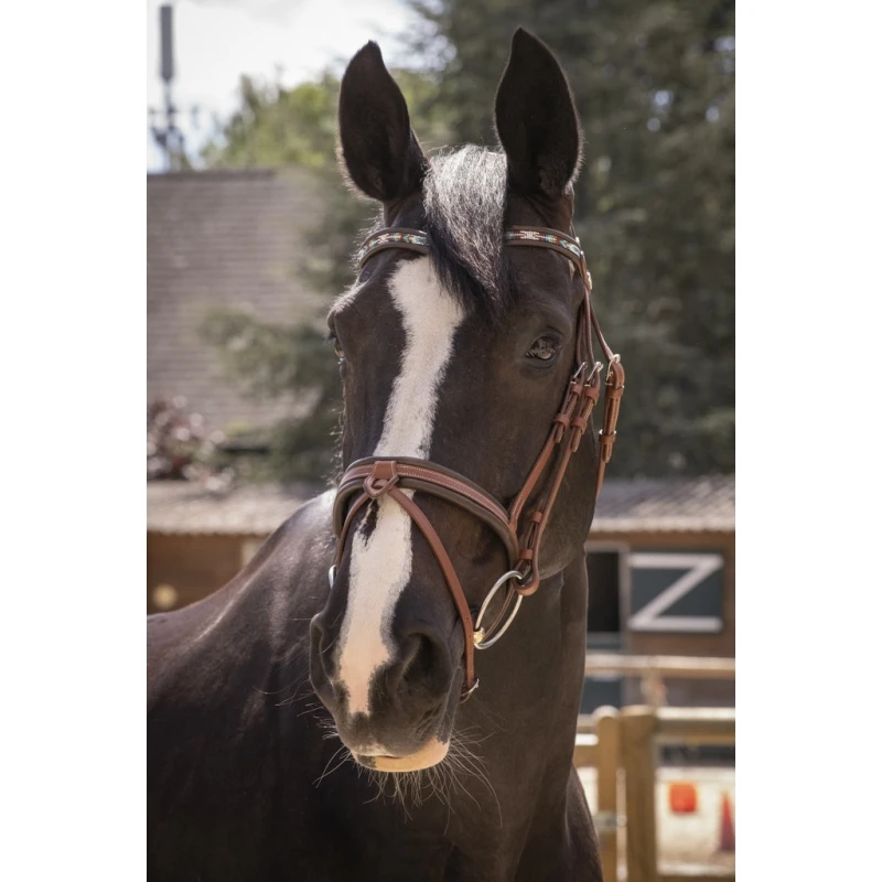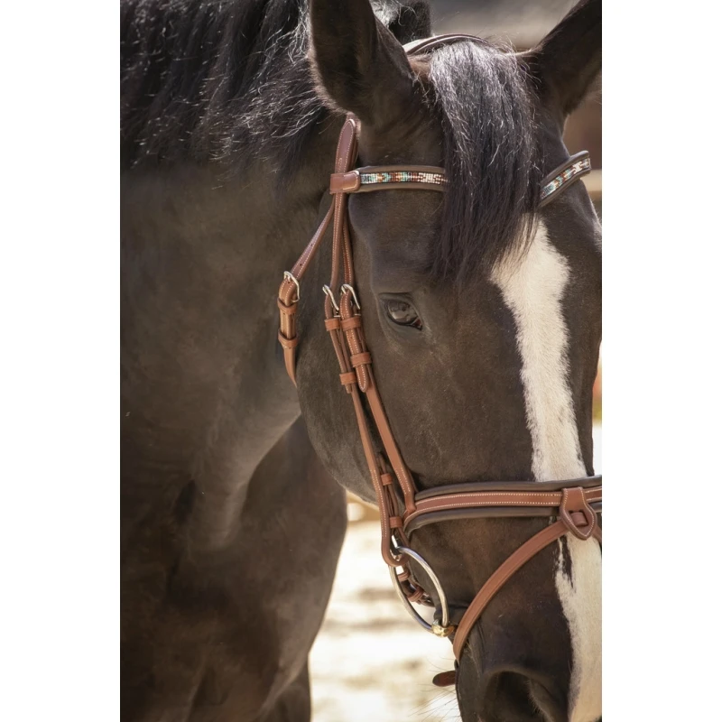 Bridon « Smoothie Pearl » Pénélope orné de surpiqûres crèmes en contraste sur la muserolle, les montants et la têtière. Le frontal incurvé est doté d’un insert de perles multicolores assorti aux ceintures, licols et colliers pour chiens du même nom. La muserolle combinée large ainsi que la têtière anatomique sont doublées d’un cuir souple très confortable pour le cheval. Les montants du bridon possèdent un élastique qui adoucit le contact avec le cheval et lui apporte plus de confort.
