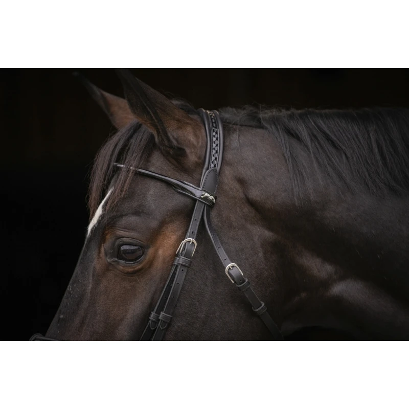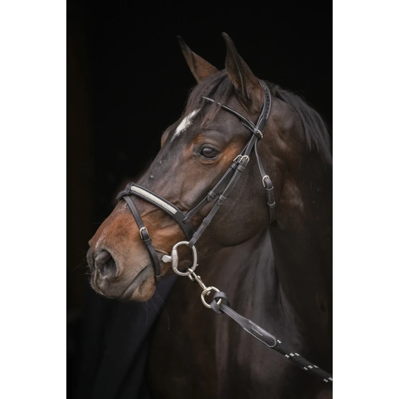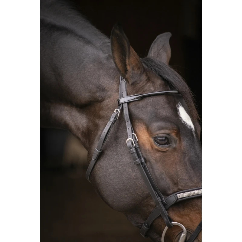 Magnifique bridon Symphonie en cuir composé d’une muserolle rehaussée de strass, d’un frontal rond verni et d’une têtière en point sellier verni. Sa muserolle combinée possède un noseband détachable si vous n’en avez pas l’utilité. Ce bridon, comme un bijou, est à utiliser les jour de concours hippiques avec la plus grande des délicatesses.