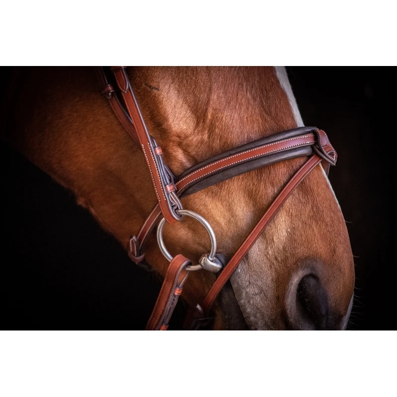 L’élégance et la sobriété de notre bridon US. Sans véritables fioritures, ce modèle va à l’essentiel avec son joli cuir noisette. Ses renforts doublés de matelassures confortables sont en contraste sous la têtière, le frontal et la muserolle combinée avec noseband amovible. Ils permettent de limiter la pression exercée sur le chanfrein et la nuque. Le bridon US Noisette est vendu seul, sans rênes, que vous pouvez choisir entre le modèle tressé et le modèle en caoutchouc.