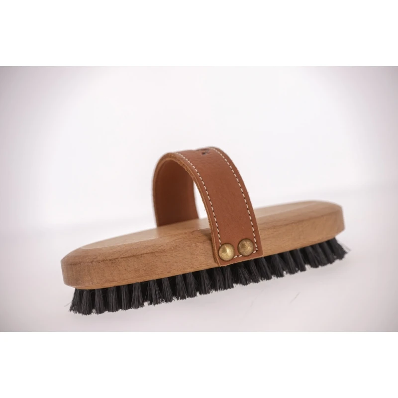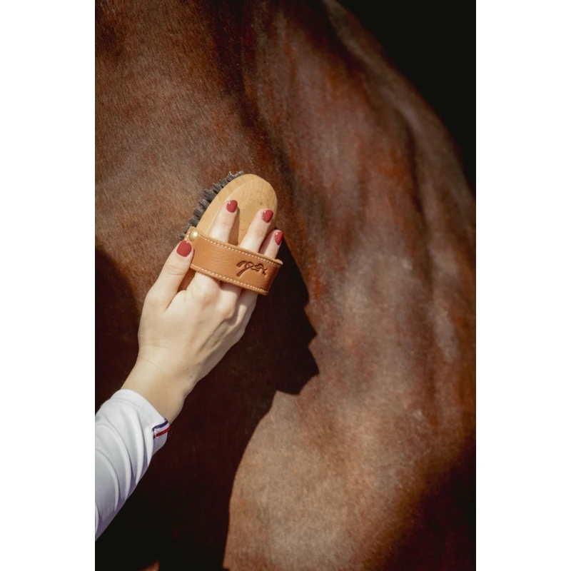 Brosse Extra Douce Pénélope, dotée de poils doux sur l’extérieur de l’ovale et d’une autre sorte, encore plus douce, à l’intérieur. Cette brosse de pansage est idéale pour brosser les zones sensibles du cheval, lui offrant ainsi un confort optimal. Elle est équipée d’une anse en cuir cognac pour une bonne prise en main, et le logo Pénélope est embossé sur celle-ci.