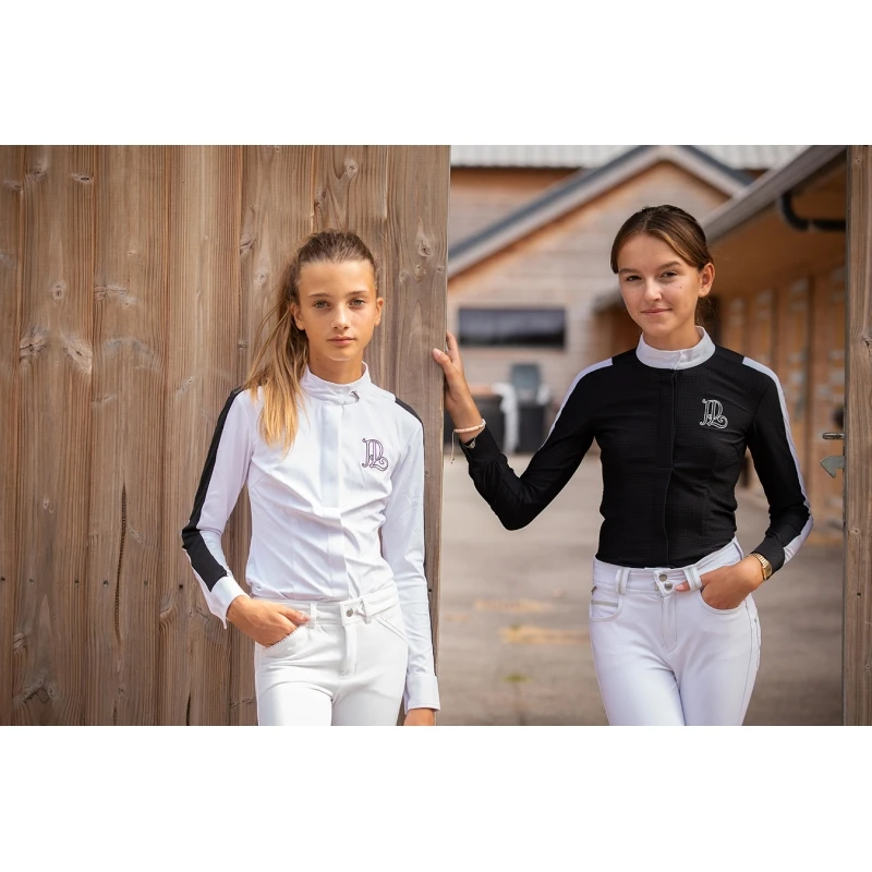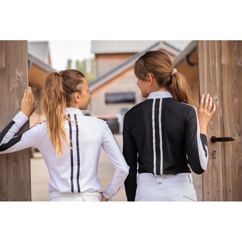 Un modèle de chemise de concours à manches longues qui va se fondre sous votre veste de concours ou tout simplement sur vous ! Son tissu si doux et ultra-stretch se porte près du corps et se rentre parfaitement dans votre pantalon de concours pour un cintrage parfait. La chemise Showshirt se ferme par une rangée de boutons cachés par une jolie patte. Sur les épaules et le long des bras, on trouve une bande noire en contraste réalisée dans un tissu micro-aéré qui rendra cette chemise très respirante et agréable à porter. Dans le dos, deux fines bandes de tissu noir (différent de celui présent sur les bras) apportent un look original et dessinent joliment la ligne de dos. Son col officier est légèrement moins montant que d’habitude et toujours réhaussé d’une petite breloque argentée du logo Pénélope.
