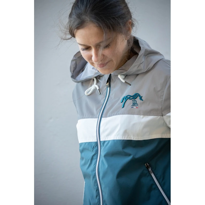 Déjà disponible l’année dernière dans les coloris marine et camel, notre coupe-vent Celecce nous revient en bleu canard pour embellir les journées de printemps pluvieuses. Le Celecce est confectionné dans un tissu léger et doux, très agréable à porter. Il s’associe parfaitement avec un jean ou avec un pantalon d’équitation. Il se porte un peu large car sa coupe n’est pas cintrée et il conviendra donc à de nombreuses morphologies. Il est doté d’une capuche bien enveloppante rehaussée d’un cordon blanc, de deux poches zippées et d’une fermeture éclair sur le devant. Son look tricolore en bloc est particulièrement dans l’air du temps. Le logo de la marque est brodé en bleu sur le cœur.
