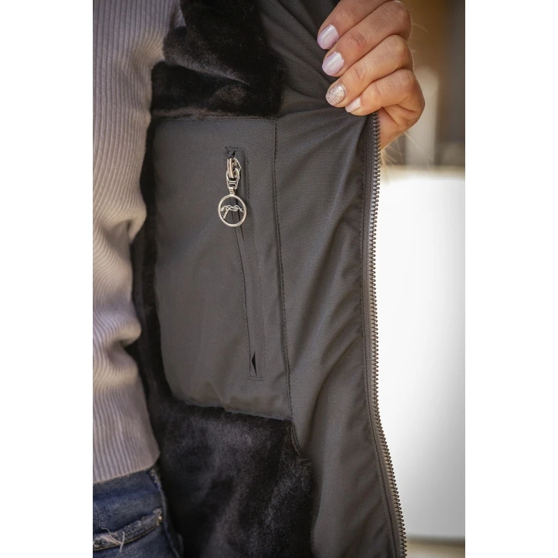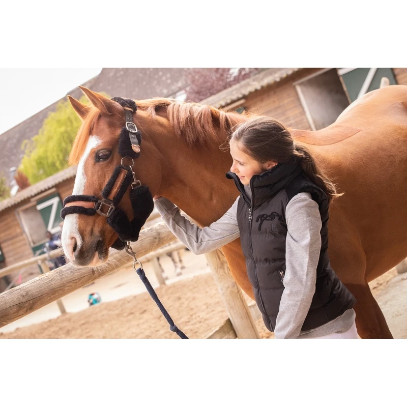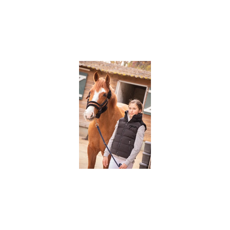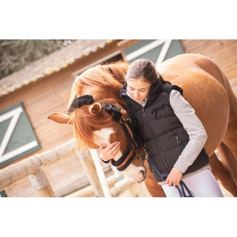 Elle est confectionnée dans un tissu stretch sur lequel des empiècements en velours s’intègrent parfaitement et lui apporte cette touche de féminité qui s’emporte aux écuries comme en ville.