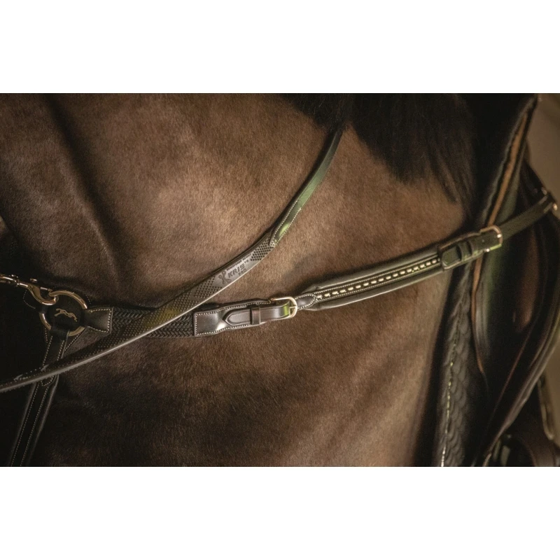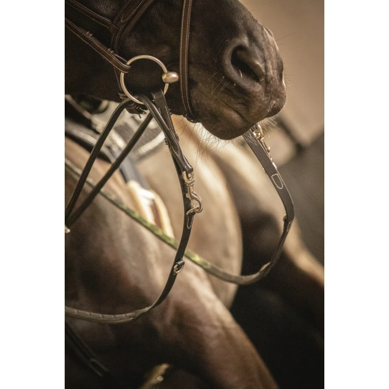 Enrênement Howlett Pénélope compatible avec notre martin collier. Il se fixe sur l’anneau central du martin collier, et permet au cheval de travailler en montant sa ligne de dos. Lorsque le cheval cède, l’enrênement Howlett cède lui aussi et permet d’éliminer les nuisances de la main du cavalier. Il s’utilise avec notre paire de rênes Howlett Pénélope.