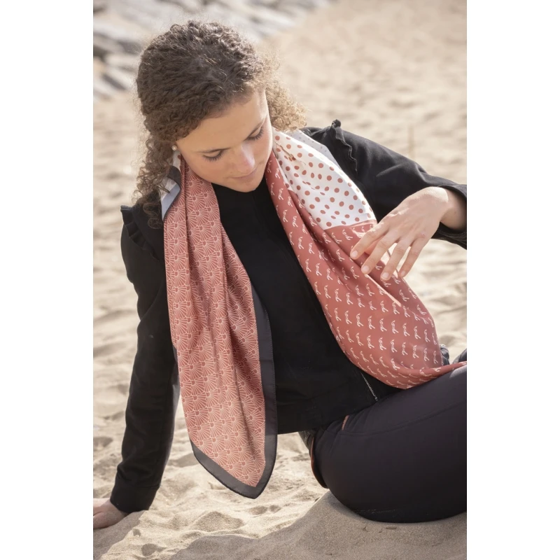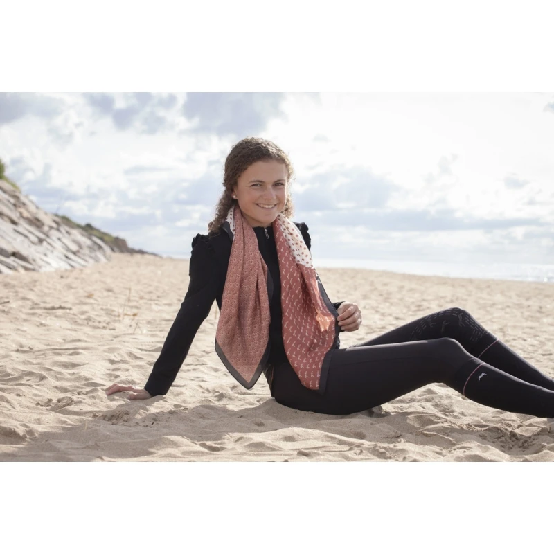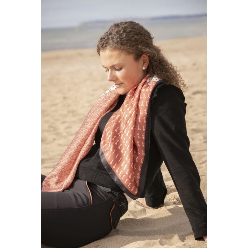 Le foulard Mya est à la fois léger et très doux à porter. Son imprimé alterne entre motifs à pois, art déco et le petit cheval Pénélope. Ce foulard carré se porte facilement autour du cou, en ceinture ou accroché à une anse de sac à main. Il apporte une touche équestre à vos looks aux écuries comme en ville.
