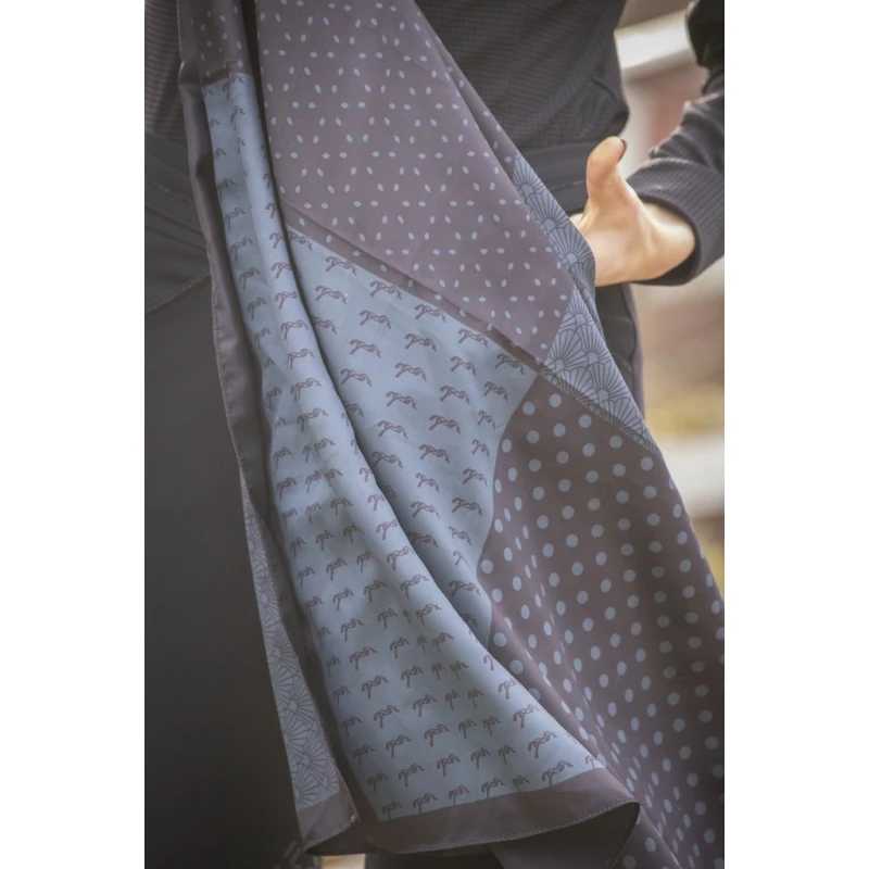 Le foulard Mya est à la fois léger et très doux à porter. Son imprimé alterne entre motifs à pois, art déco et le petit cheval Pénélope. Ce foulard carré se porte facilement autour du cou, en ceinture ou accroché à une anse de sac à main. Il apporte une touche équestre à vos looks aux écuries comme en ville.