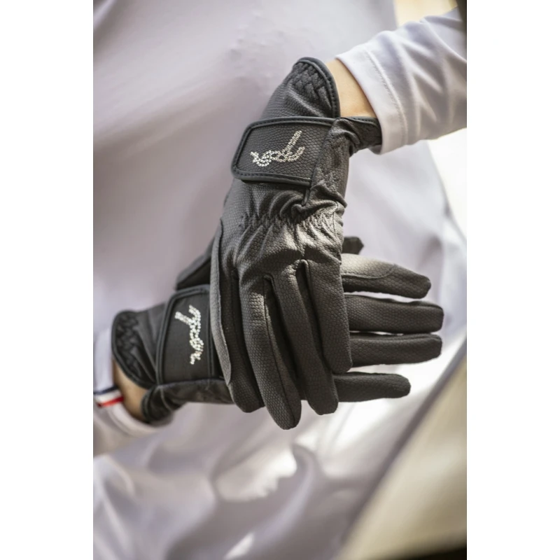 Chics et girly les gants « Prisma » Pénélope sont très confortables à porter tous les jours. Ils sont fins et bien ajustés et permettent aux cavaliers de garder toute leur dextérité à cheval. La zone entre le pouce et l’index est renforcée pour une meilleure résistance dans le temps. Ils se ferment grâce à un velcro sur le dessus de la main et s’adaptent ainsi à plusieurs tailles de poignets. Sur ce velcro, on trouve le logo Pénélope en strass qui donne cette touche chic et discrète, 100% dans l’esprit Pénélope. Ils peuvent s’utiliser à la fois quotidiennement aux écuries mais aussi en compétition.
