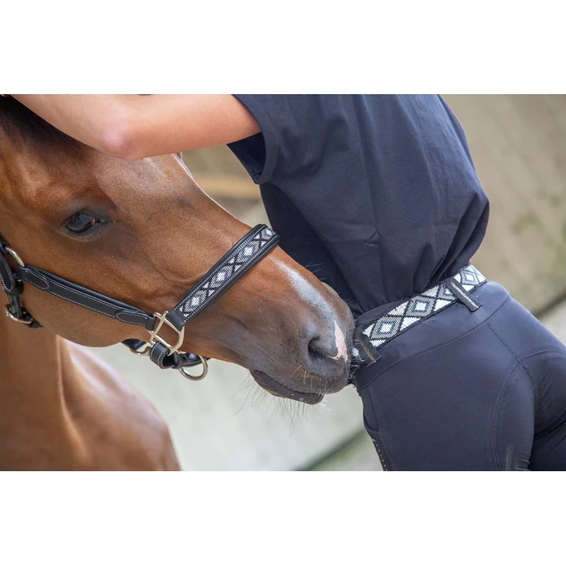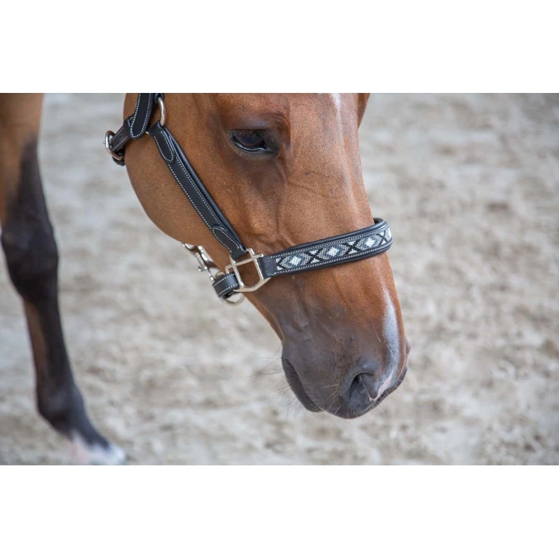 Pour bien compléter notre collection Pearl, déjà composée de ceintures et de colliers pour chiens, nous avons ajouté ce licol en cuir et perles. Il est doté d’une bouclerie en acier inox. Pour le mettre rapidement sur la tête de votre cheval, il s’ouvre sous les ganaches grâce à un mousqueton. Il est parfaitement ajustable grâce à son réglage sous la muserolle et à son double réglage sur la têtière.