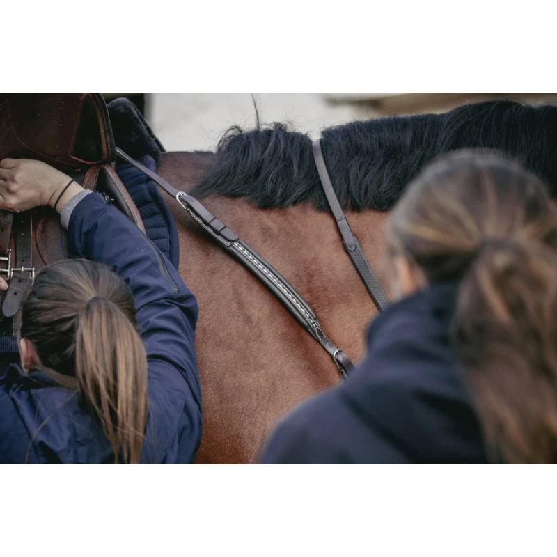 Un réglage simple au niveau du poitrail permet aussi aux chevaux généreux dans l’effort de ne pas se prendre l’antérieur dans l’attache à la sangle.