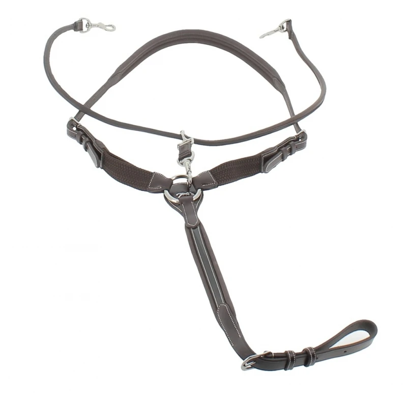 Un réglage simple au niveau du poitrail permet aussi aux chevaux généreux dans l’effort de ne pas se prendre l’antérieur dans l’attache à la sangle.