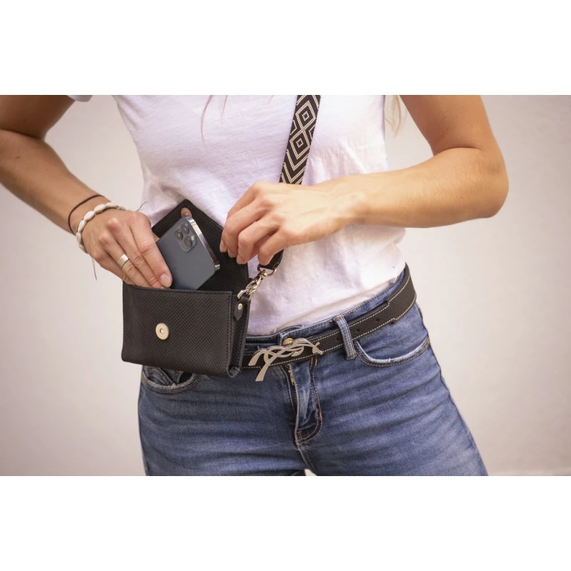 Pochette pour Téléphone qui se porte soit accrochée à la ceinture ou soit en bandoulière grâce à sa lanière aux jolis motifs géométriques.