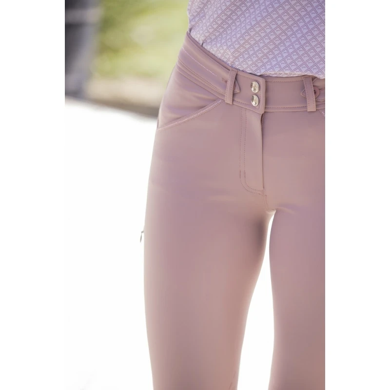 Le pantalon d’équitation Élégance rose poudré est doté d’un rang de strass sur la sur-ceinture et également le long des deux poches avant et arrière. Un petit cheval Pénélope, lui aussi en strass, est posé au milieu de la cuisse gauche. Très discrète. Ce pantalon d’un grand confort grâce à son tissu stretch, a des renforts anti-dérapants à l’intérieur des genoux et une taille légèrement haute, bien ajustée. Le bas de jambe est en lycra pour s’adapter à de nombreuses morphologies. C’est une très jolie pièce féminine et confortable à porter qui fera sensation à l’écurie.