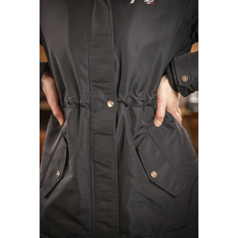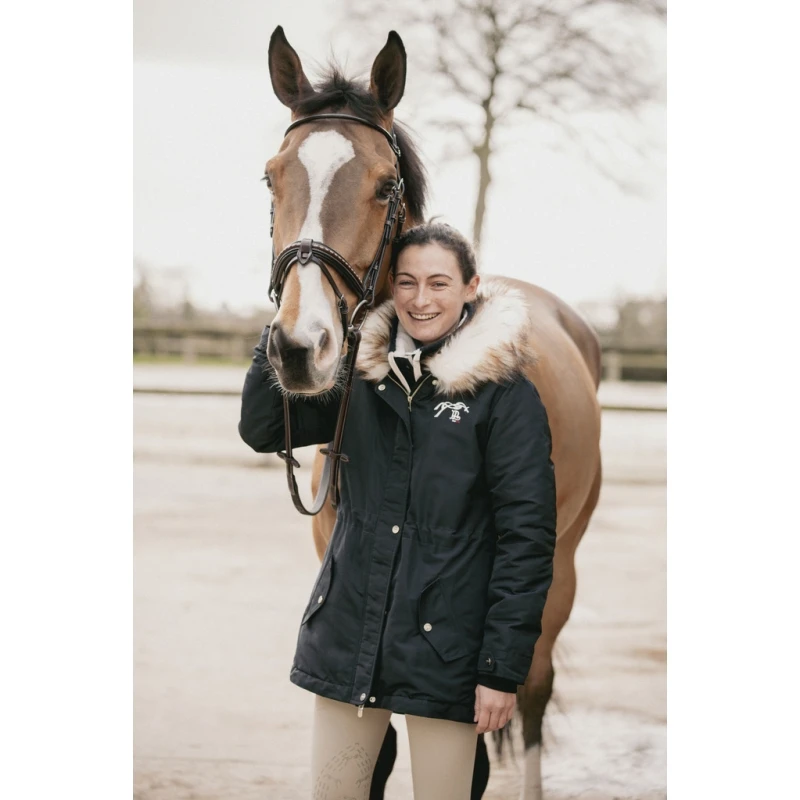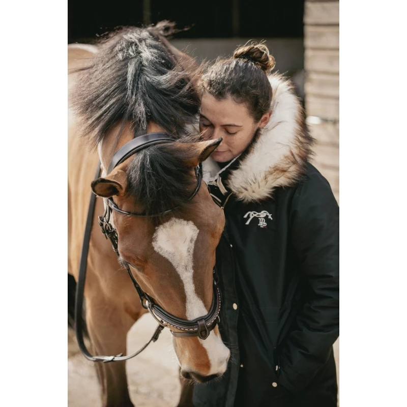 Parka Pénélope « Mega Lyon » créée sur la base du mythique bombers Lyon de la marque mais disponible ici dans une version mi-longue. Dotée d’un grand zip sur le devant avec un rabat à pressions, il est doublé d’une belle épaisseur de polaire ultra-douce et sa capuche est entourée d’une très belle fausse fourrure. La parka Mega Lyon a un cordon de serrage à la taille et deux poches en biais fermées avec des pressions de chaque côté. Légèrement plus long, à l’arrière, elle est dotée d’une fente pour plus de confort. Elle est idéal à porter aux écuries à pied, mais aussi en ville durant la saison froide.