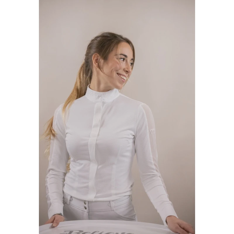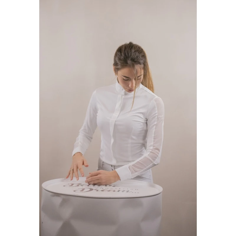 Polo de concours Las Honey confectionné dans un tissu blanc alvéolé, léger et respirant. Il est doté d’un col officier rehaussé de délicates surpiqûres ton sur ton et d’un plastron ton sur ton qui se ferme par un rang de boutons caché par une patte. Pour une touche féminine et glamour, un empiècement en tissu voile transparent parcourt la longueur des manches. Sur la manche longue gauche le logo Pénélope apparaît dans une matière type gomme. Chic et technique, il se porte facilement en concours hippiques pour un look sobre et efficace.
