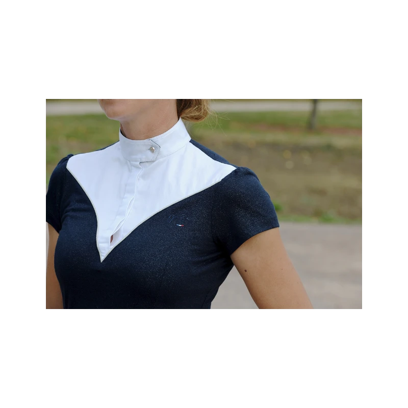 Le polo de concours Las Vegas se décline en version manches courtes pour les beaux jours. Il garde son plastron blanc surmonté d’un passepoil en lurex et son joli col officier. Le bouton du col est décalé vers la gauche.