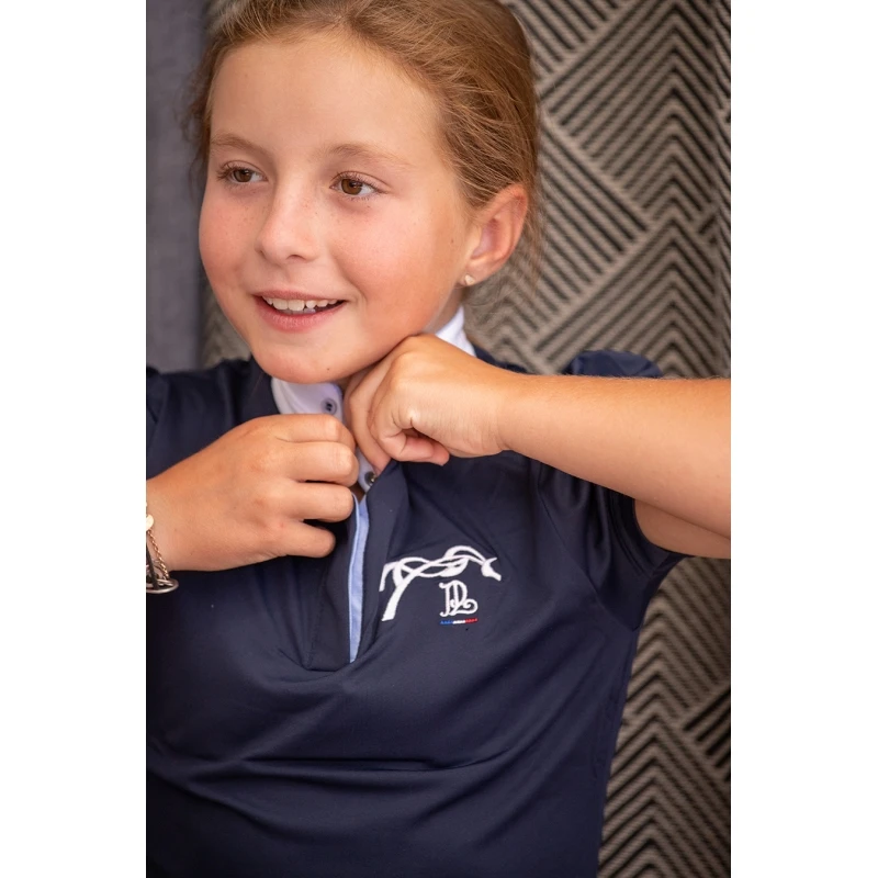 Le polo de concours Madrid Eden by Pénélope, que vous connaissez si bien en taille adulte et qui vous plait tant depuis plusieurs saisons, se décline ici en marine pour changer un peu de la traditionnelle couleur blanche. Très féminin, il a de jolies manches courtes légèrement froncées, un col qui se ferme par une pression cachée et rehaussé de deux petits boutons de chaque côté, à l’extérieur. Son col officier blanc est décoré d’un petit liseré bleu ciel en contraste. Deux boutons sont visibles à l’extérieur sur chaque bord du col. Le polo de concours Madrid est en tissu respirant, tout en marine avec sa broderie du logo en 3D et son petit drapeau tricolore.