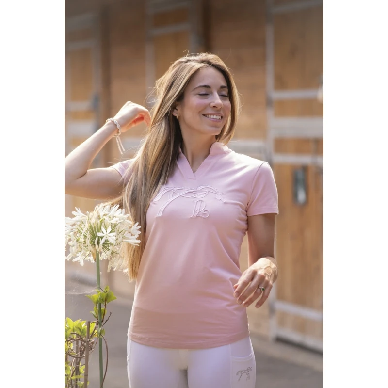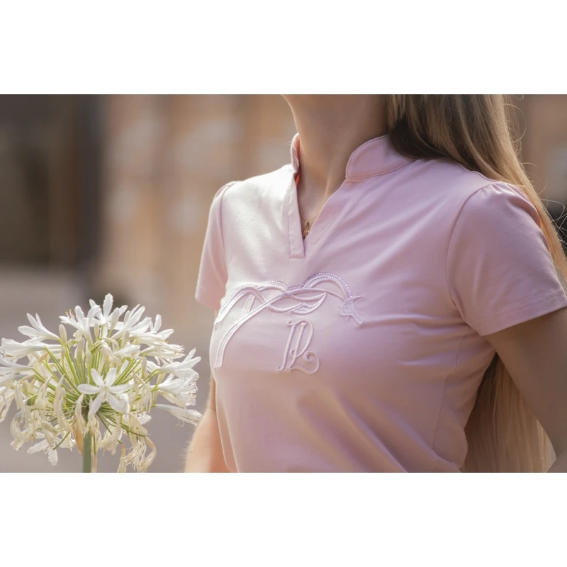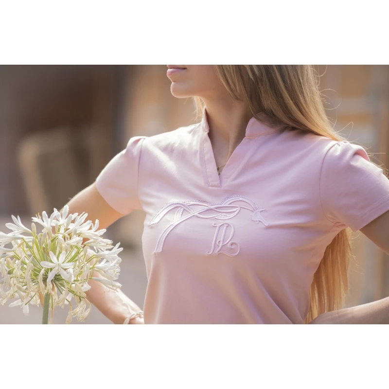 Polo Iliana doté de manches courtes, d’un col V prolongé d’un petit col officier et d’une broderie en 3D du logo Pénélope rehaussé d’un rang de strass.