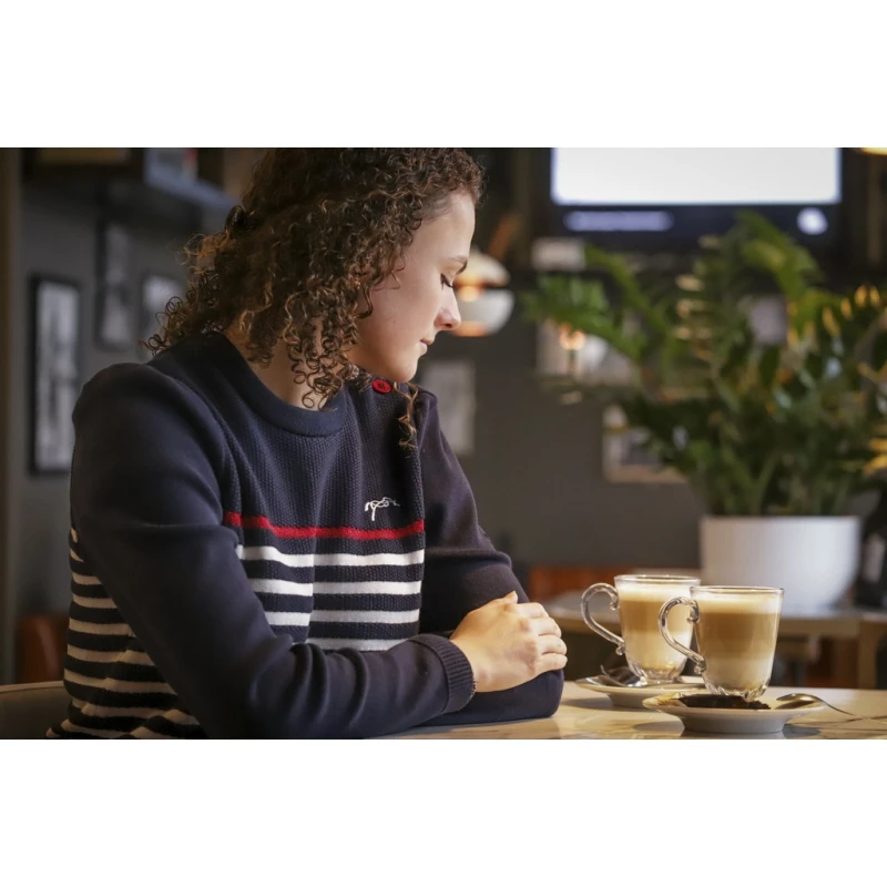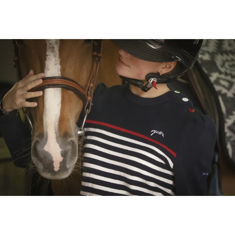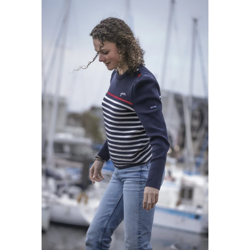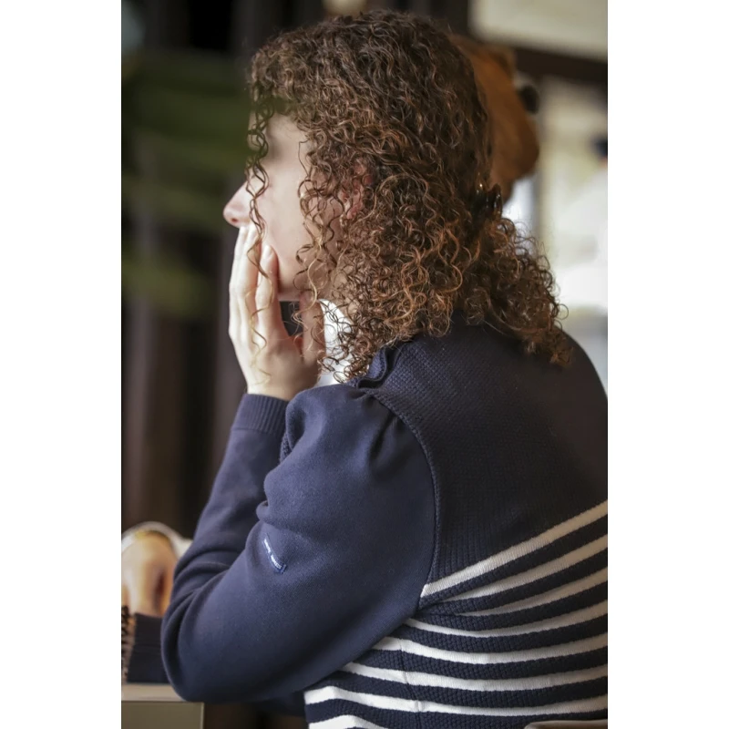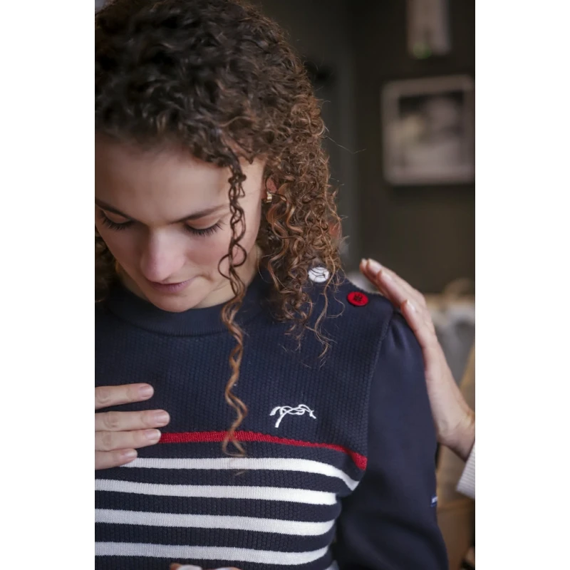 Pull « Maëlle » Pénélope issu de la collection SAINT JAMES x Pénélope Collections. Dans le pur esprit de la marinière, notre pull Maëlle est confectionné dans une maille alvéolée douce et légère. Sur l’épaule, à gauche, comme un vrai pull marin, il s’ouvre grâce à trois boutons : un marine, un blanc, un rouge, tous les trois marqués du « PL » de la marque. Sur les épaules, une légère fronce ajoute une touche féminine et raffinée. Enfin, sur la manche gauche on trouve le logo SAINT JAMES et sur le cœur, le petit logo Pénélope.