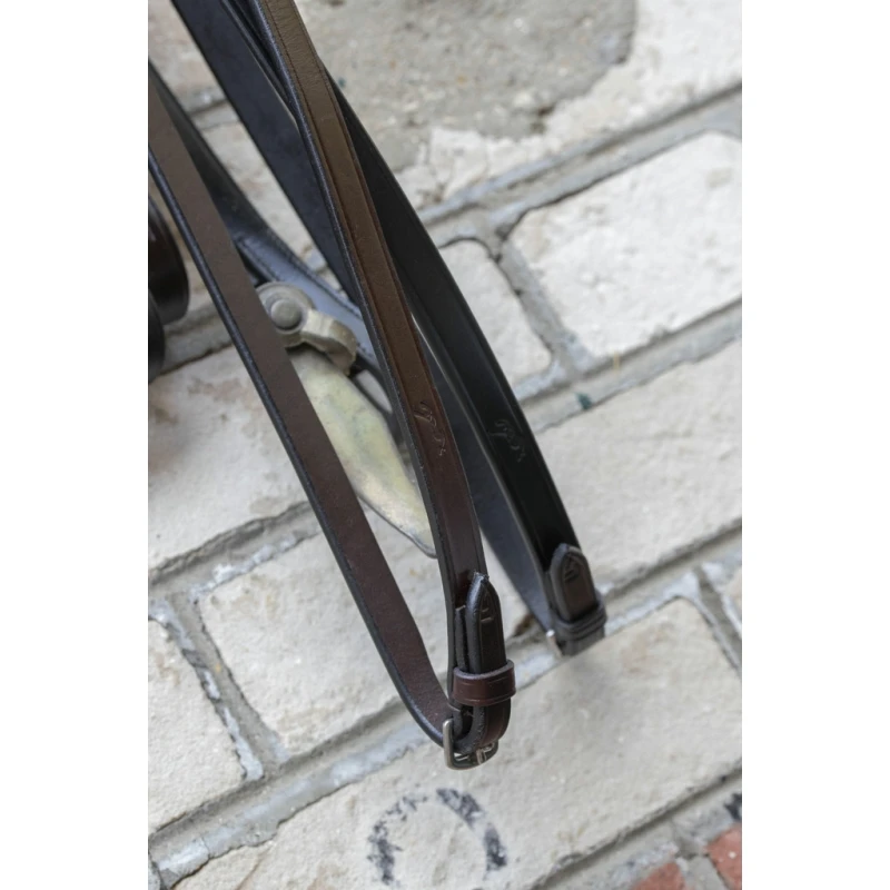 Les rênes assorties au bridon Daily, avec un caoutchouc souple et des grips en forme de V. Le logo Pénélope est délicatement embossé dans la partie haute du cuir. Les boucles sont en couleur acier, assorties au bridon.