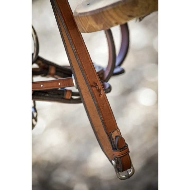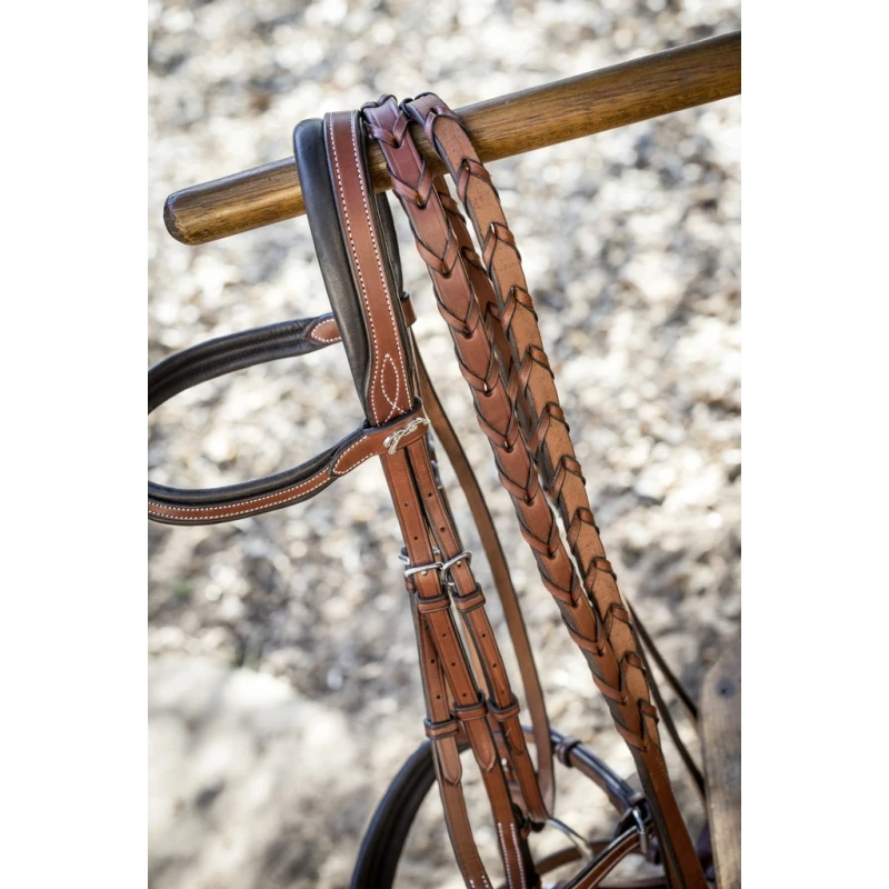 Nous avions envie d’étoffer notre gamme de rênes à assortir avec nos bridons. C’est donc une paire de rênes tressées que nous vous proposons ici, réalisées dans un très beau cuir pleine fleur. Le look tressé revient en force et nous plait pour ses qualités esthétiques mais aussi anti glisse. À l’extrémité des rênes, au niveau de la boucle, le petit logo Pénélope est embossé dans le cuir.