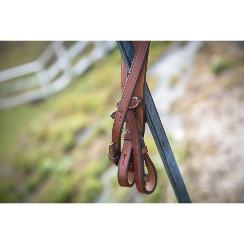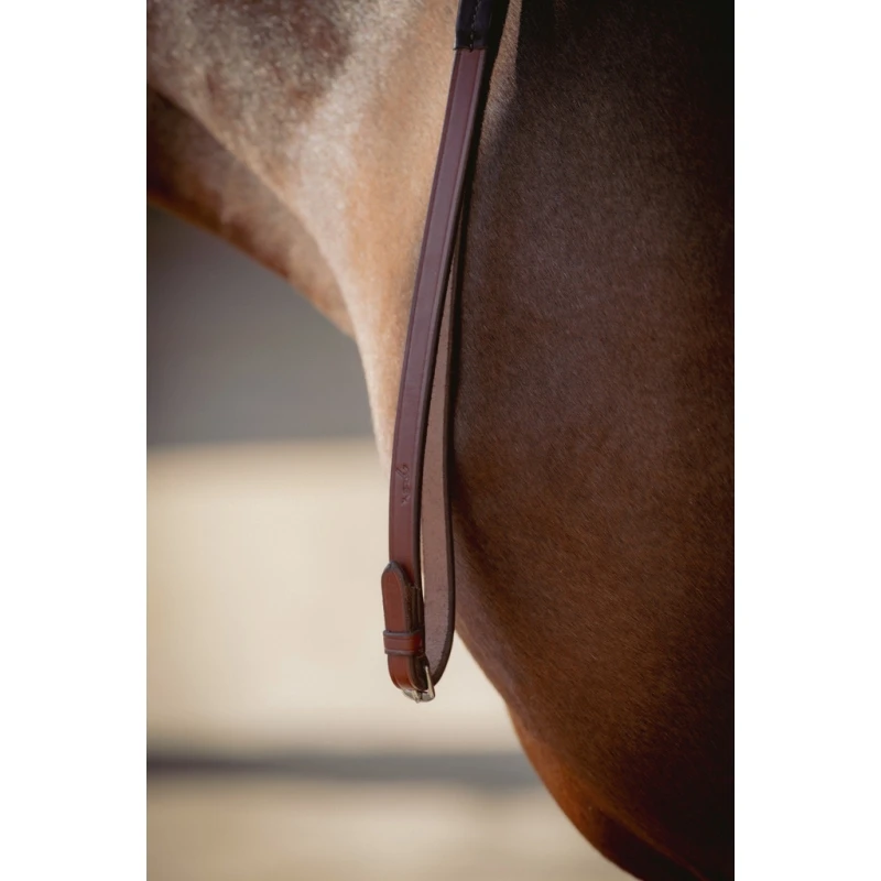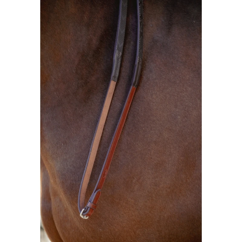 Parmi les deux modèles de rênes à assortir avec notre bridon US voici les rênes en caoutchouc. Réalisées dans un très beau cuir pleine fleur, cette paire de rênes est recouverte d’un caoutchouc très résistant et anti glisse. A l’extrémité des rênes, au niveau de la boucle, le petit logo Pénélope est embossé dans le cuir.