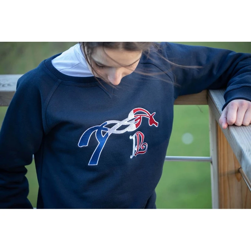 Une délicate encolure ronde, un touché en tissu sweat très doux, une broderie Pénélope aux couleurs du drapeau français et un tombé parfait légèrement loose. C’est notre sweat Chloé et il va vous accompagner en toute circonstance. Ce sweat-shirt aux lignes simples se porte facilement sur un pantalon d’équitation ou sur un jean, en ville.