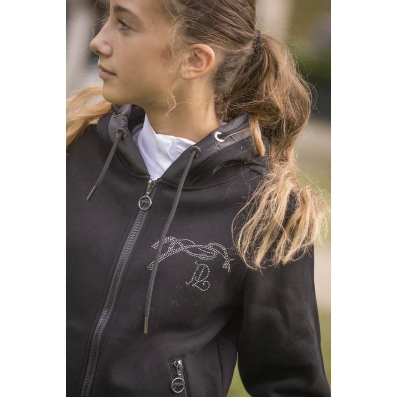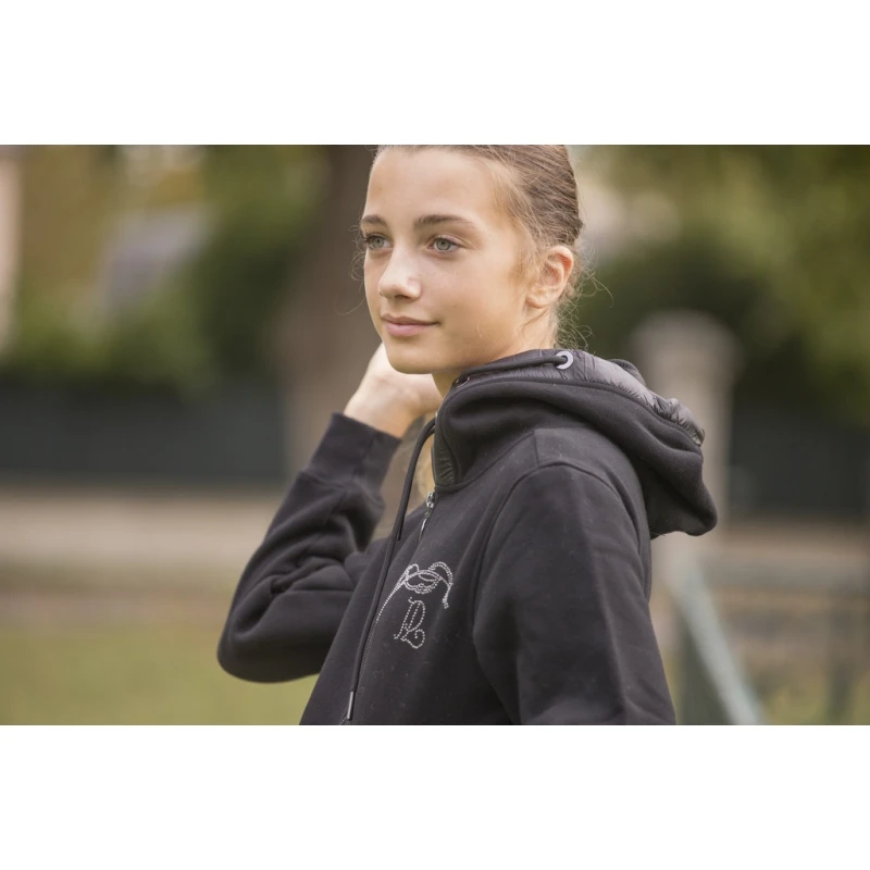 Sweat-shirt Fluore noir zippé sur le devant et orné du logo Pénélope en strass sur le cœur. Il est doté d’une capuche bi-matière de laquelle sort un cordon de serrage par deux œillets différents. Le sweat Fluore est doté de deux poches zippées à l’avant.