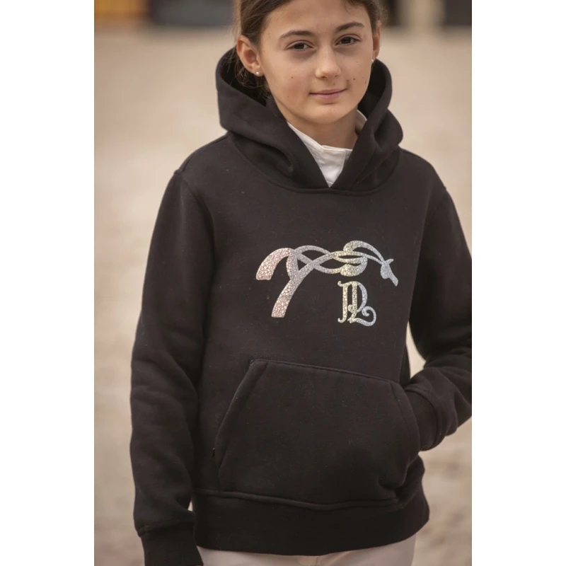 Sweat-shirt noir à capuche avec une poche centrale zippée et un marquage du logo Pénélope sur le devant dans une matière « croco rainbow«