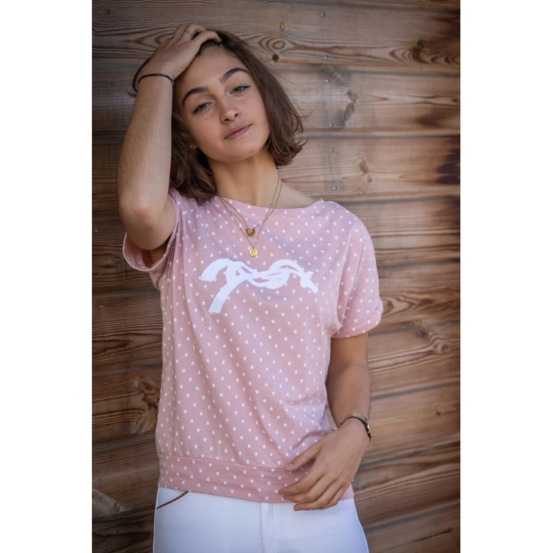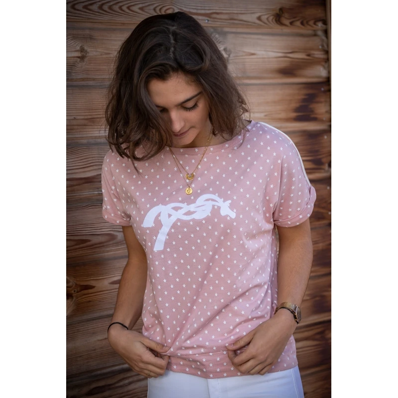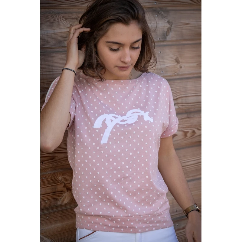 Le t-shirt Poppy pour la belle saison 2022 est coupé ni trop loose, ni trop près du corps : il s’adapte à toutes les morphologies. Fabriqué avec un tissu décoré de petites étoiles blanches, il est doté de manches courtes épurées et sans couture qui dessinent parfaitement le bras. Sur les épaules et les manches, on retrouve un galon fin blanc. Sur le devant, le logo Pénélope est flocké en velours blanc, assorti au galon. Il se porte sur ou dans un pantalon, aux écuries comme en ville, au gré de vos envies et votre style.