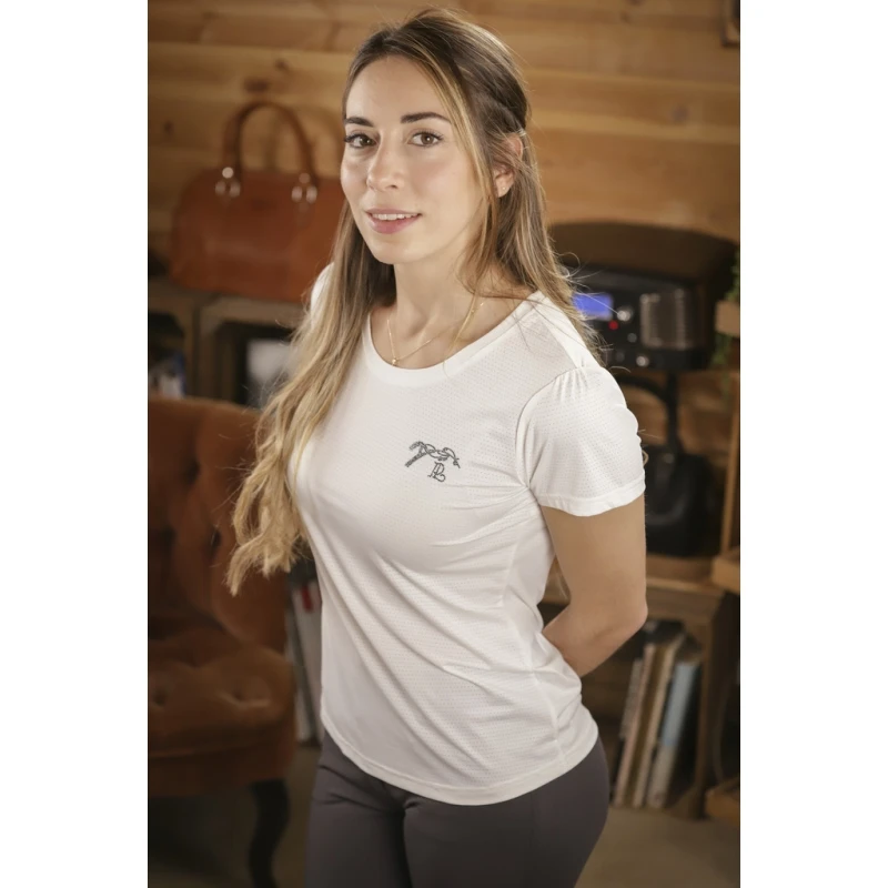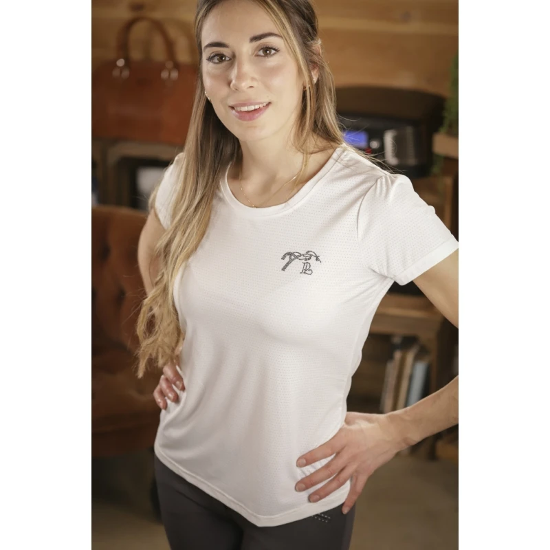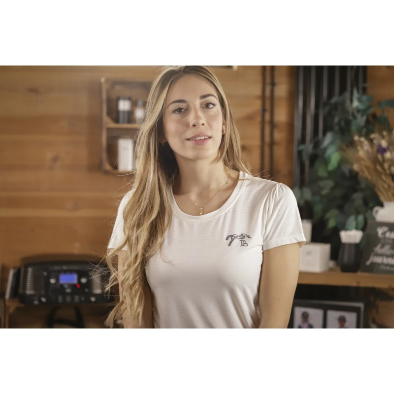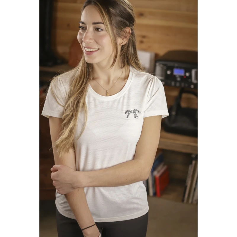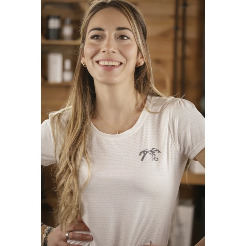 T-shirt « Techty » technique confectionné dans un tissu micro-aéré respirant et ultraléger, spécifiquement étudié pour la pratique des sports équestres ou autres sports. Il possède des manches courtes surmontées de petites fronces aux épaules. Il a un col rond joliment dessiné et un marquage du logo Pénélope en strass sur le cœur.
