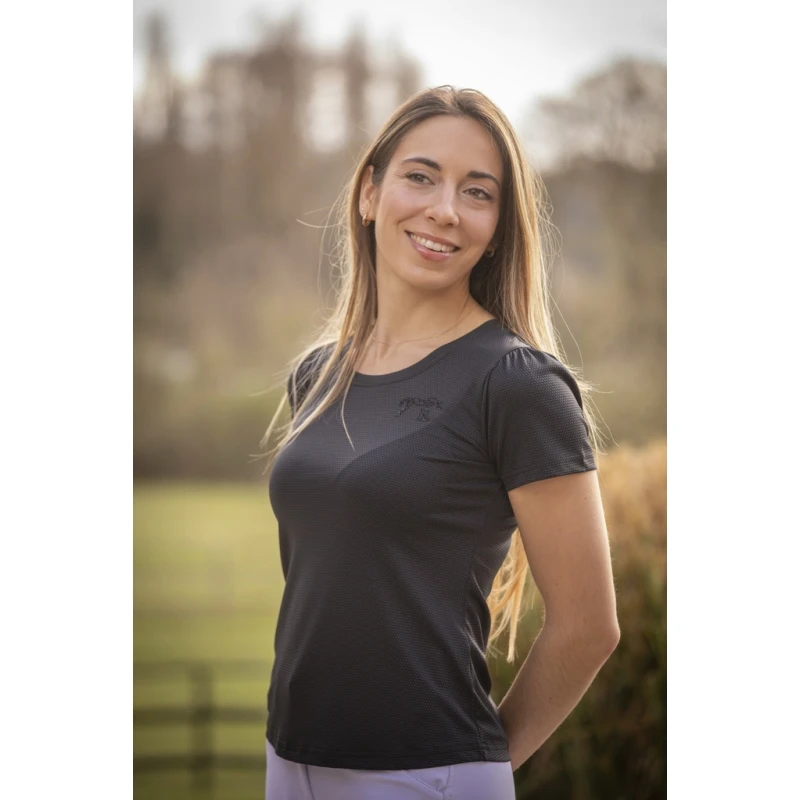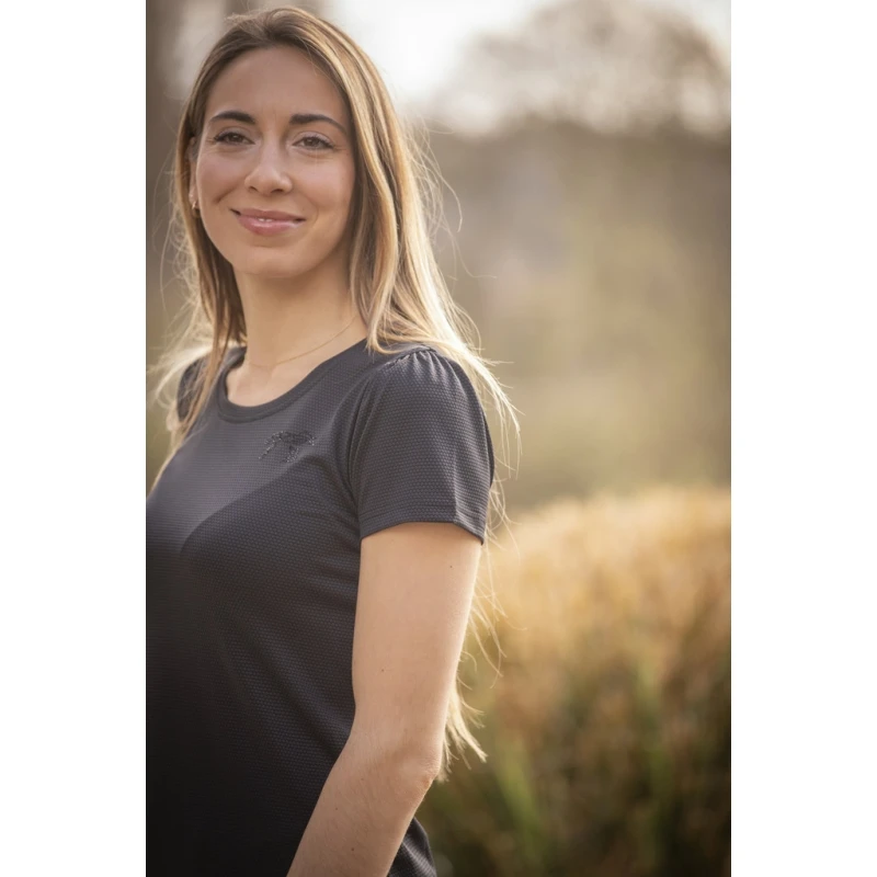 Le t-shirt Techty Honey est confectionné dans un tissu technique micro-aéré respirant. Ultraléger et légèrement gaufré, il est original et sobre à la fois et spécifiquement étudié pour la pratique du sport équestre ou d’autres sports. Il possède des manches courtes rehaussées de petites fronces et un marquage du logo en strass sur le cœur.