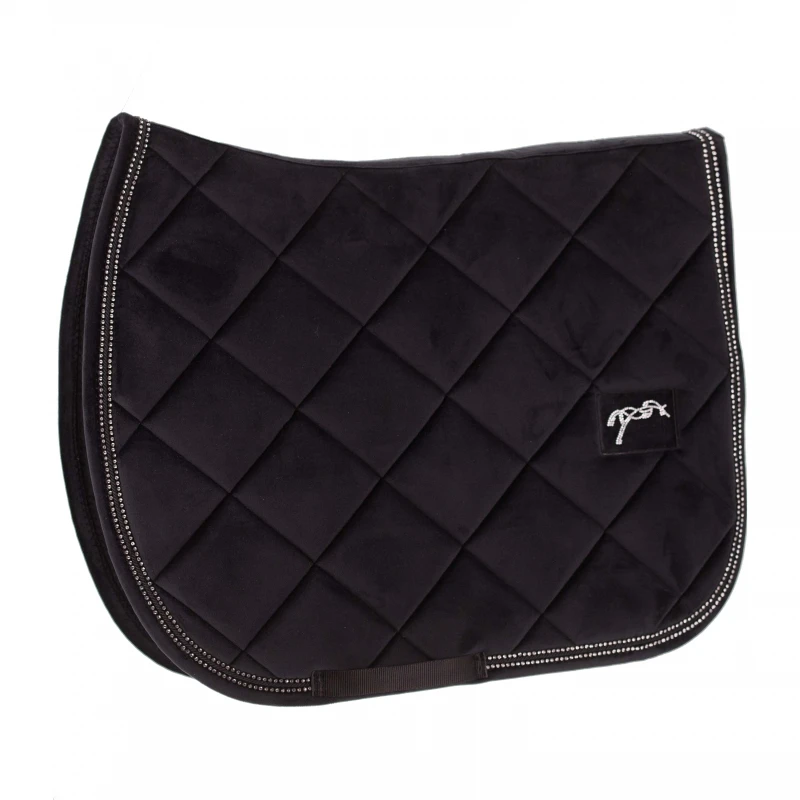 Tapis de selle New Strass matelassé en losange. Effet velours, est orné d’un galon et du logo Pénélope, le tout en strass. Sa ligne de dos est bien dégarrottée et il est doté d’un passant de sangle de chaque côté. Le tapis New Strass s’accorde parfaitement avec le bonnet assorti de la même collection.