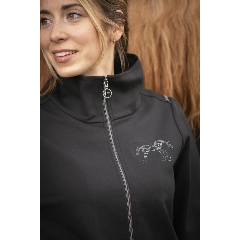 Veste légère au look « sporty chic » zippée sur le devant. Elle a un col montant et deux poches zippées de chaque côté. Elle est légèrement resserrée en bas par un petit élastique. Les épaules sont froncées et rehaussées d’un galon à la fois verni et brillant. Le logo Pénélope apparaît en strass sur le cœur.